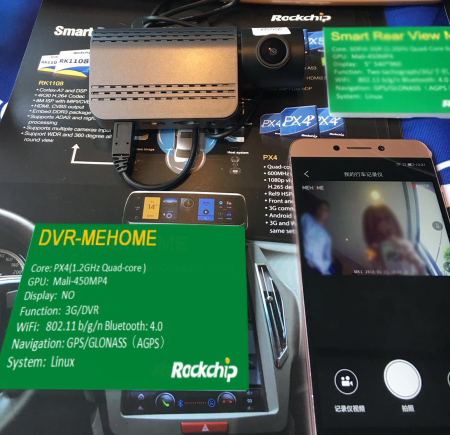 Rockchip高階PX4車聯(lián)網(wǎng)方案,四核處理器,Mali-450GPU,助力車聯(lián)網(wǎng)產(chǎn)品全面升級(jí)。本次展出了搭載PX4方案的行車記錄儀,基于Linux系統(tǒng),支持前后1080P+720P雙錄、網(wǎng)絡(luò)在線直播、Wifi無線透?jìng)鳎瑫r(shí)延200ms內(nèi)、BT4.0抓拍按鍵、GPS軌跡追蹤、優(yōu)秀的功耗控制;可通過手機(jī)APP觀看實(shí)時(shí)或錄制影像。