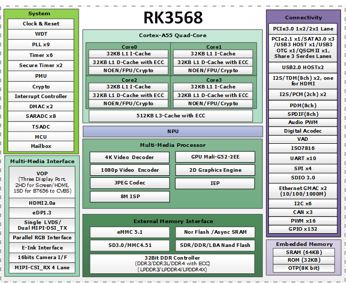 瑞芯微RK3568 CPU為四核Cortex-A55,采用全新Arm v8.2-A架構(gòu),效能有效提升;GPU為Mali-G52 ,雙核心架構(gòu),圖像API支持OpenGL ES 3.2, 2.0, 1.1,Vulkan 1.1。內(nèi)置瑞芯微自研第三代獨(dú)立NPU,可提供1T算力,支持Caffe/TensorFlow/TFLite/ONNX/PyTorch/Keras/Darknet主流架構(gòu)模型的一鍵轉(zhuǎn)換。