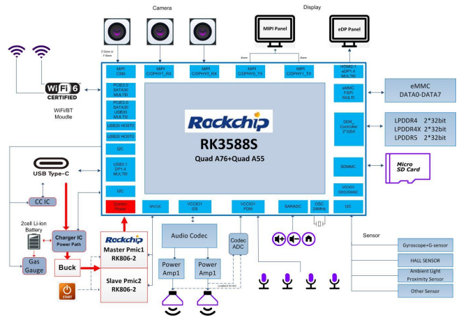 RK3588S同樣配備RK806-2PMIC的供電方案;存儲采用 LPDDR4XeMMCSD3.0;擁有 eDP TXMIPI D/C PHY TXMIPI D/C PHY RXMIPI DPHY RXPCIe20TYPEC、音頻輸出、陣列MIC輸入等外設(shè)接口。