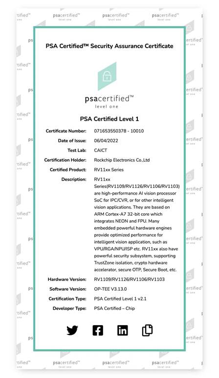 近日,瑞芯微RV11xx系列芯片(RV1126/RV1109/RV1106/RV1103)正式通過PSA Certified Level 1安全認(rèn)證。該認(rèn)證是一項(xiàng)國際權(quán)威認(rèn)證,為Arm聯(lián)合多家獨(dú)立安全測(cè)試實(shí)驗(yàn)室及咨詢機(jī)構(gòu),面向物聯(lián)網(wǎng)芯片、軟件和設(shè)備推出的相關(guān)測(cè)試與認(rèn)證,旨在確保IoT產(chǎn)品從設(shè)計(jì)到實(shí)際應(yīng)用的安全性。