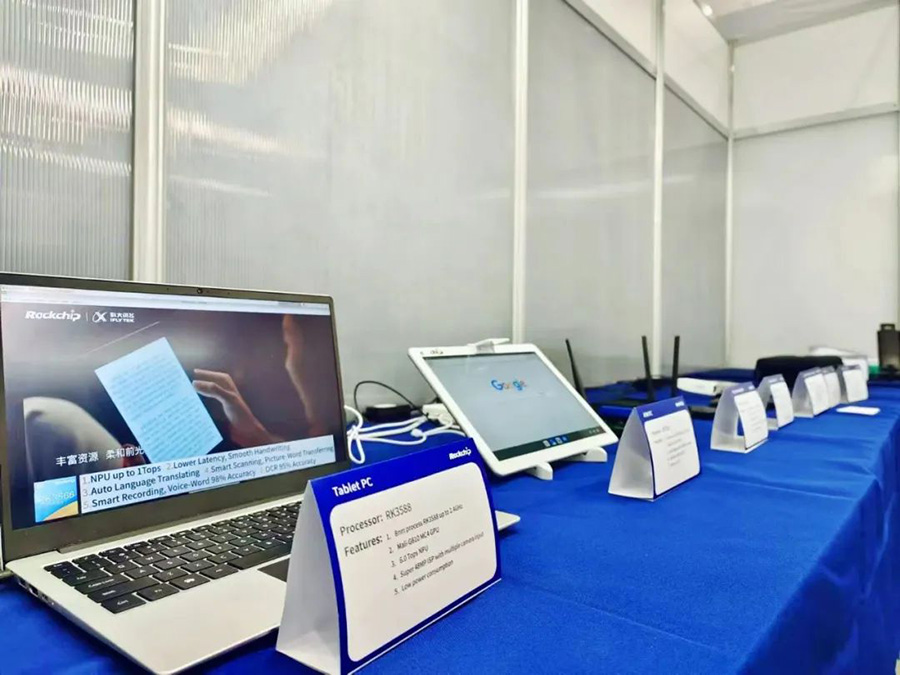 現(xiàn)場展出了系列搭載新一代AIoT旗艦芯RK3588的產(chǎn)品包括AR、游戲盒子、高端平板、Arm PC、邊緣計(jì)算盒子等應(yīng)用,海外用戶對RK3588的強(qiáng)大的算力及8K顯示性能有更直觀的體驗(yàn)。