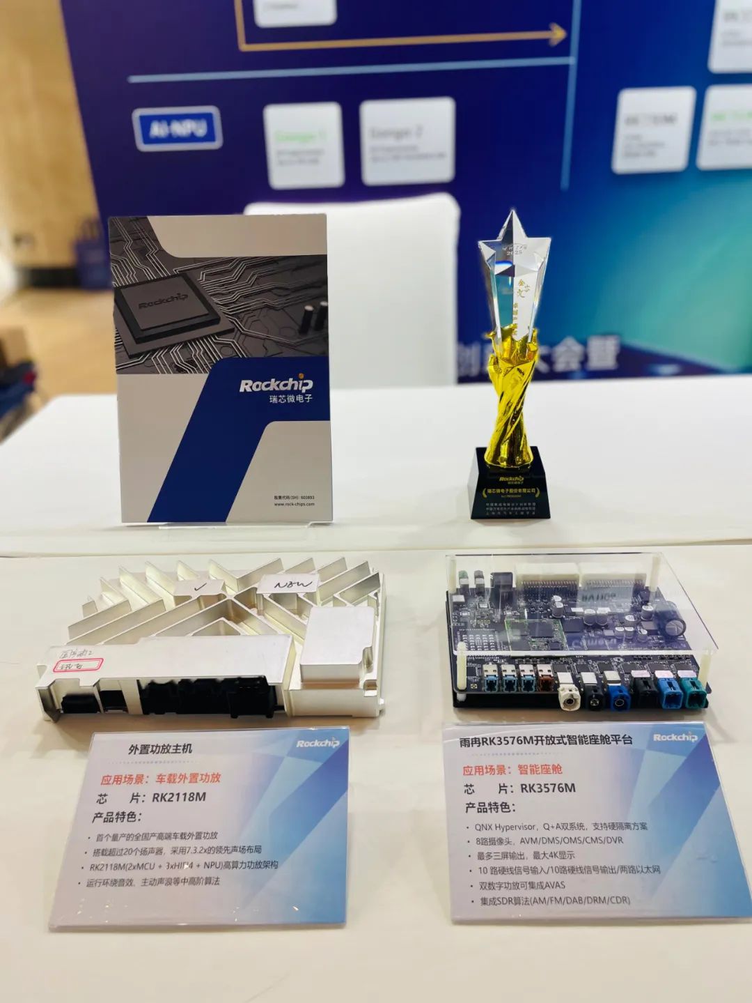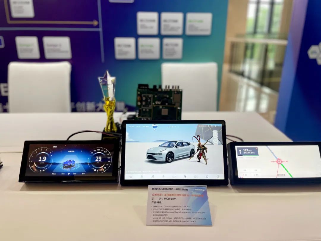 現(xiàn)場,瑞芯微展示了搭載RK3588M集成端側(cè)小模型(Deepseek、Gemma3)的中階艙泊一體QNX虛擬化平臺(tái)、RK3576M高性價(jià)比入門級艙泊一體平臺(tái)以及可實(shí)現(xiàn)路噪主動(dòng)降噪、獨(dú)立聲場分區(qū)、虛擬現(xiàn)場等多樣化高階功能的RK2118M外置功放主機(jī)。