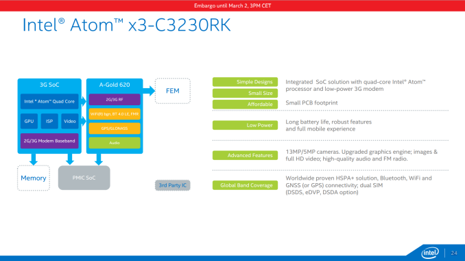 Th ex3 sits at the bottom, and is comprised of Bay Trail based SoCs at the 28nm no deal previously part of the SoFIA program aimed at emerging markets. There will be three x3 parts – a dual core x3, a quad core x3 from the Rockchip agreement, and a final quad core x3 with an integrated LTE modem.