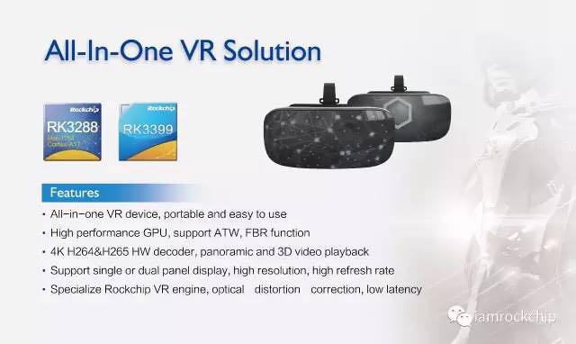 The two types of VR cameras meet three standards of VR industry: 20ms latency, more than 75Hz screen refresh rate and more than 1K gyroscope refresh rate. Rockchip VR camera solutions have outstanding capacity of 4K 360° panoramic video decoding, can support 2K/dual FHD screen, distortion-resistant, dispersion-resistant and pupil distance optical algorithm of software, left-and-right split screen of both software and hardware and other technical characteristics.