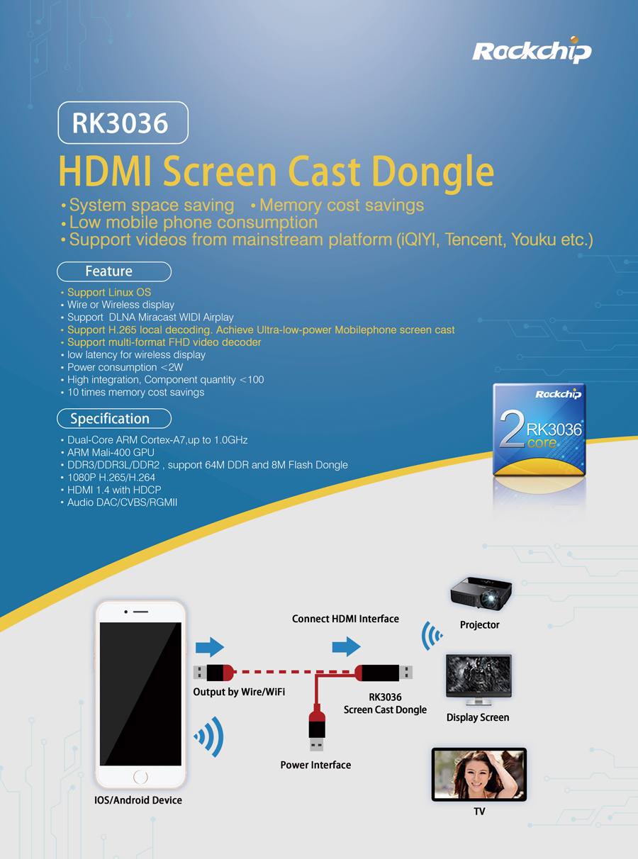 Compared with the traditional Android Miracast Dongle devices, RK3036 solution adopts Linux OS, avoiding the problems of stability and bad experience caused by mass redundant junk files in Android.